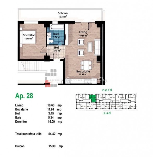 » 2 camere, 1 konyha, 1 fürdőszoba, 54 m2