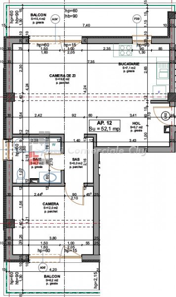 » 2 camere, 1 konyha, 1 fürdőszoba, 52 m2