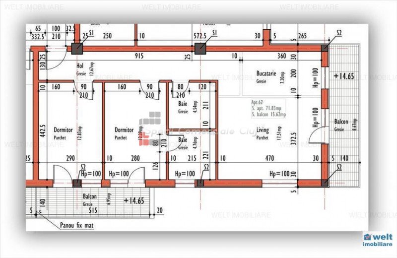 » 3 camere, 1 konyha, 1 fürdőszoba, 64 m2