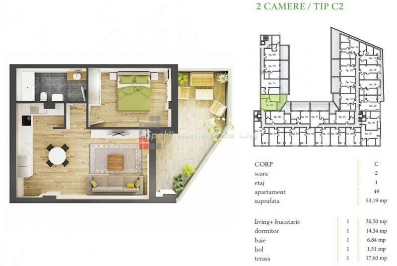 » 2 camere, 1 konyha, 1 fürdőszoba, 56 m2
