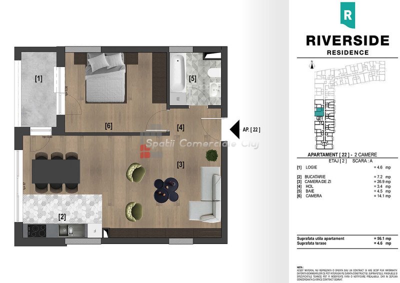 » 2 camere, 1 konyha, 1 fürdőszoba, 46 m2