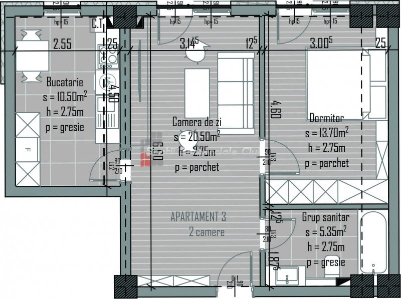 » 2 camere, 1 konyha, 1 fürdőszoba, 52.69 m2