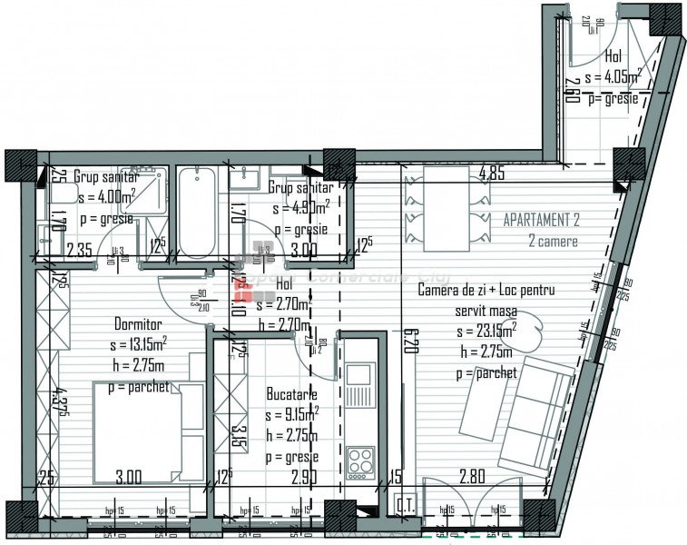 » 2 camere, 1 konyha, 1 fürdőszoba, 56 m2