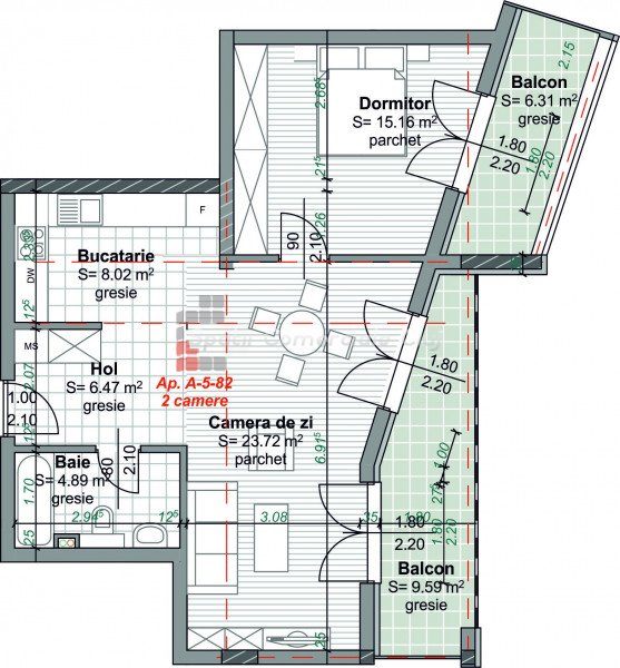 » 2 camere, 1 konyha, 1 fürdőszoba, 55.4 m2