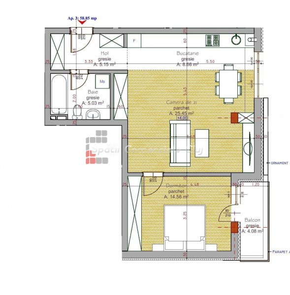 » 2 camere, 1 konyha, 1 fürdőszoba, 55.55 m2
