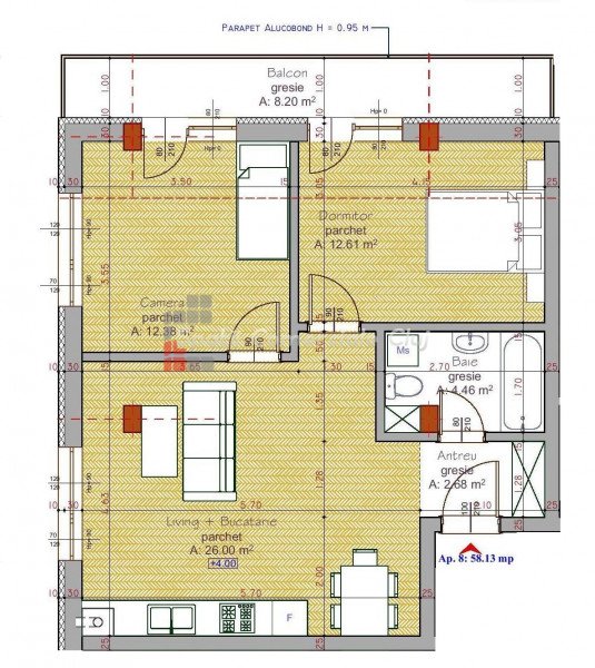» 3 camere, 1 konyha, 1 fürdőszoba, 64 m2