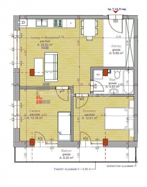 » 3 camere, 1 konyha, 1 fürdőszoba, 56 m2