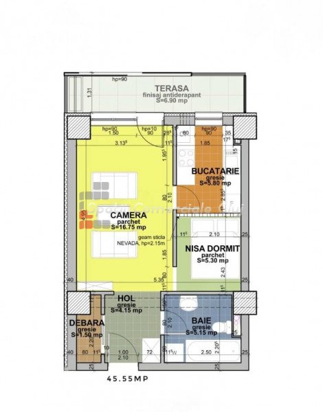 » 2 camere, 1 konyha, 1 fürdőszoba, 48 m2