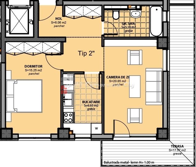 » 2 camere, 1 cuisine, 1 salle de bain, 58 m2