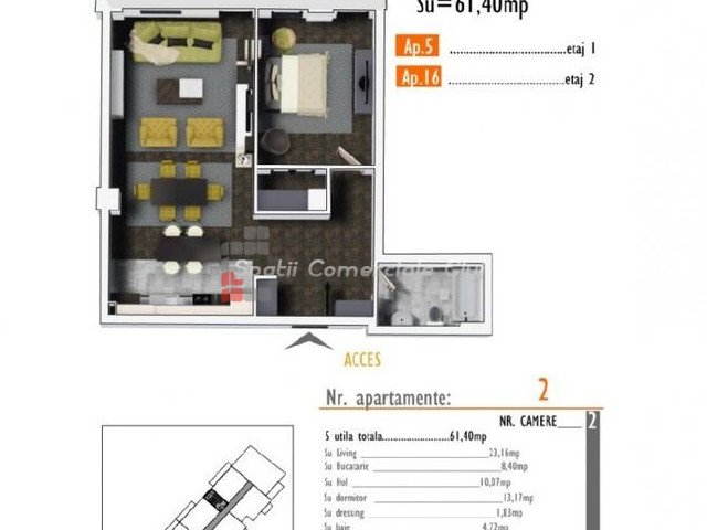 A Spatii Comerciale Cluj eladásra kínál egy 2 szobás lakást Baciuban, a Petrom utcában található épületben.
