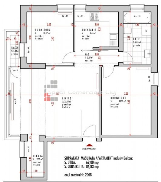 » 3 camere, 1 konyha, 1 fürdőszoba, 64 m2