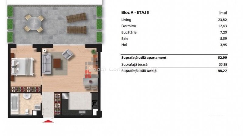 » 2 camere, 1 konyha, 1 fürdőszoba, 52 m2