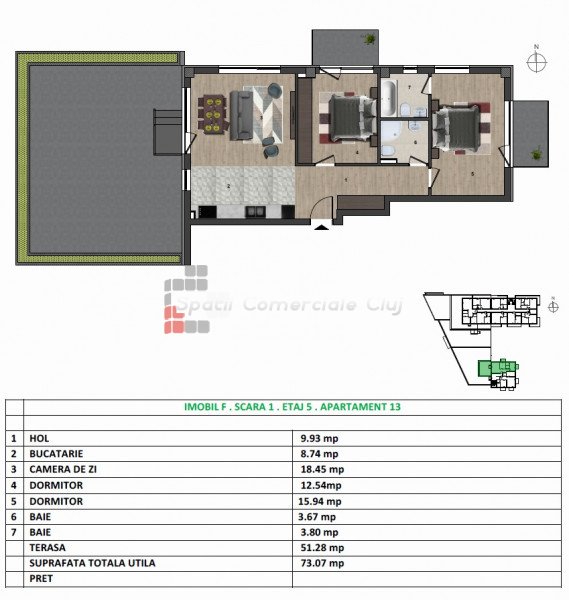 A Spatii Comerciale Cluj közvetít egy 3 szobás lakás eladását a VIVO-ban, 1 parkolóhellyel az árban.