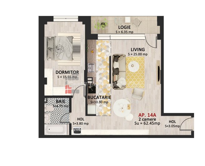 » 2 camere, 1 konyha, 1 fürdőszoba, 57 m2