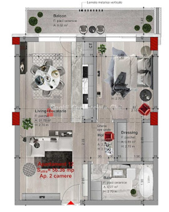 » 2 camere, 1 cuisine, 1 salle de bain, 55 m2