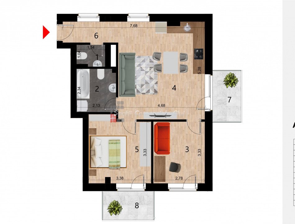 » 3 camere, 1 konyha, 1 fürdőszoba, 56 m2