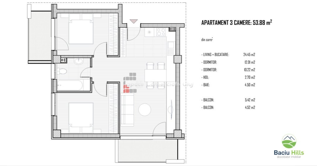 » 3 camere, 1 konyha, 2 Fürdők száma, 76.92 m2
