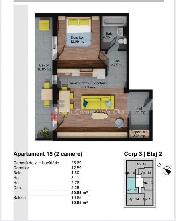» 2 camere, 1 konyha, 1 fürdőszoba, 48 m2
