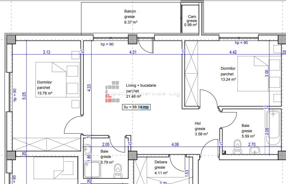 » 3 camere, 1 konyha, 1 fürdőszoba, 72 m2