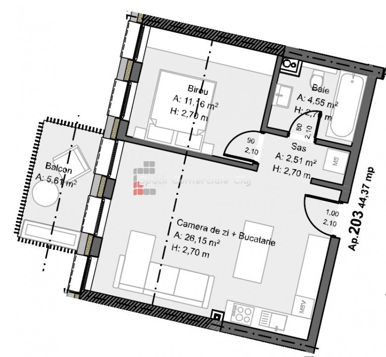 » 1 szoba, 1 konyha, 1 fürdőszoba, 27 m2