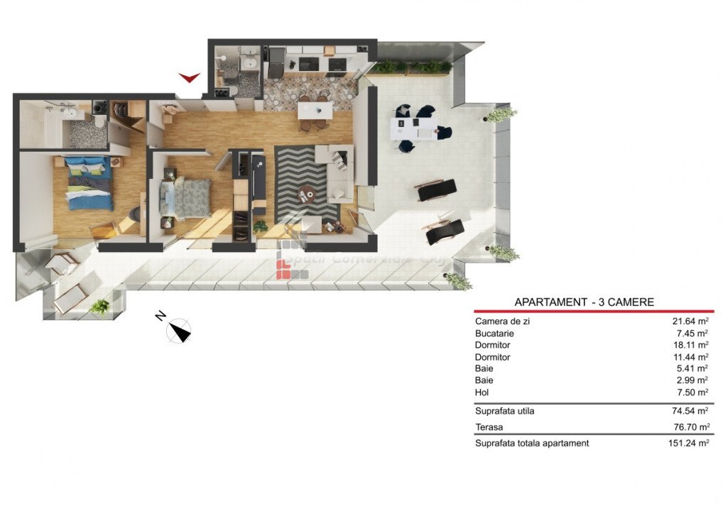 » 3 camere, 1 konyha, 2 Fürdők száma, 77 m2