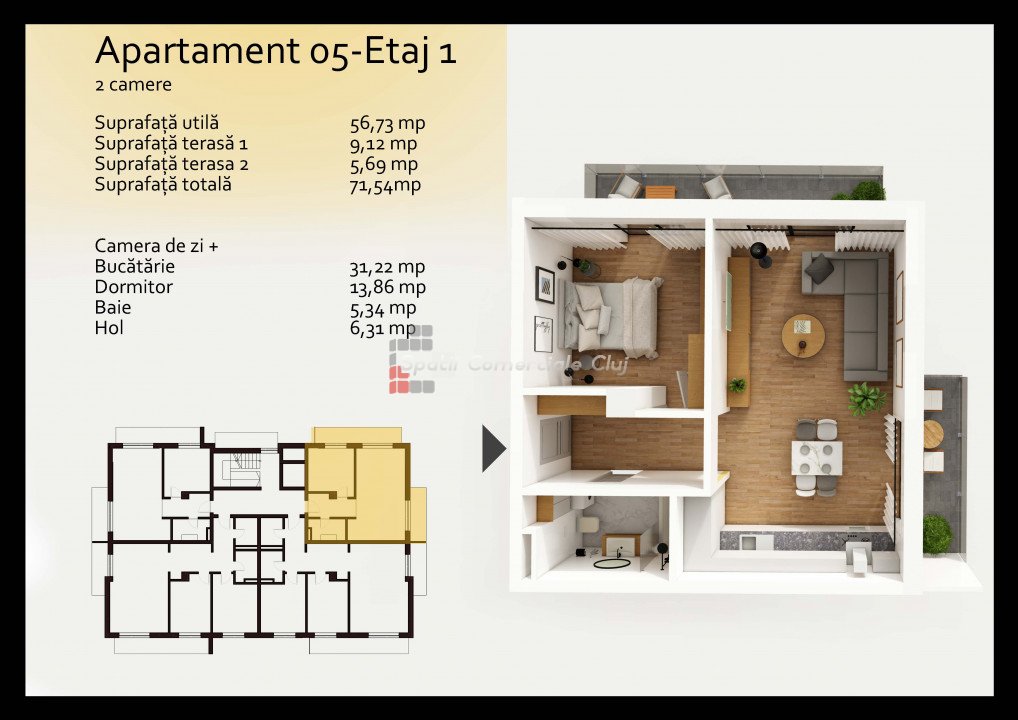 Spatii Comerciale Cluj vous propose à la vente un superbe appartement avec chauffage au sol.