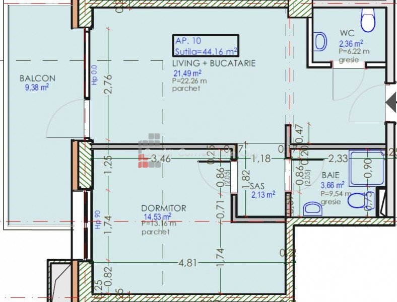 » 2 camere, 1 konyha, 1 fürdőszoba, 44 m2