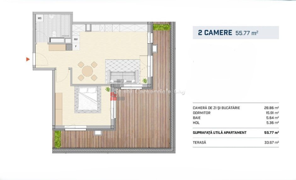 » 2 camere, 1 konyha, 1 fürdőszoba, 54 m2