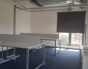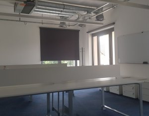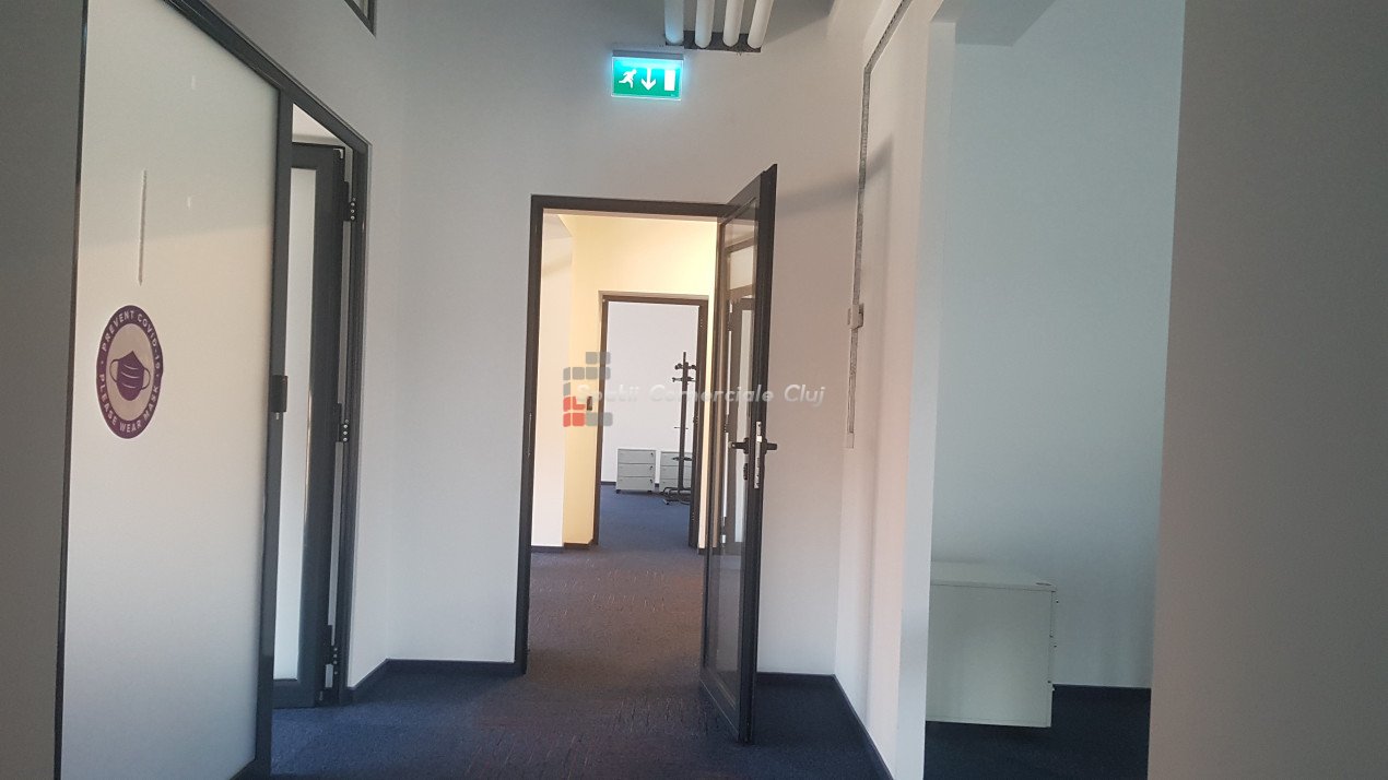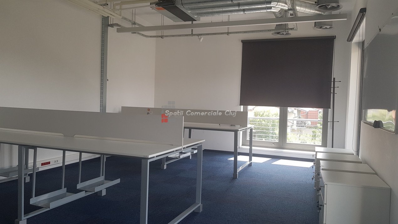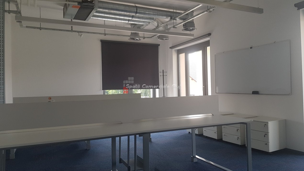 Spatii Comerciale Cluj ofera spre inchiriere spatiu birou cu o incapere, 50mp, in cladire Office, situata in zona piata Cipariu. Cladirea moderna este dotata cu sistem control acces, iluminat LED, ferestre generoase, mocheta, sistem de ventiloconvectoare HVAC, generator de rezerva. Beneficiaza de serviciu de receptie si paza fizica in timpul noptii. Locuri de parcare contra cost sunt in curtea imobilului. Toate costurile cu utilitati (apa, elecctricitate, incalzire/racire, receptie) sunt incluse in cei 15eur/mp.