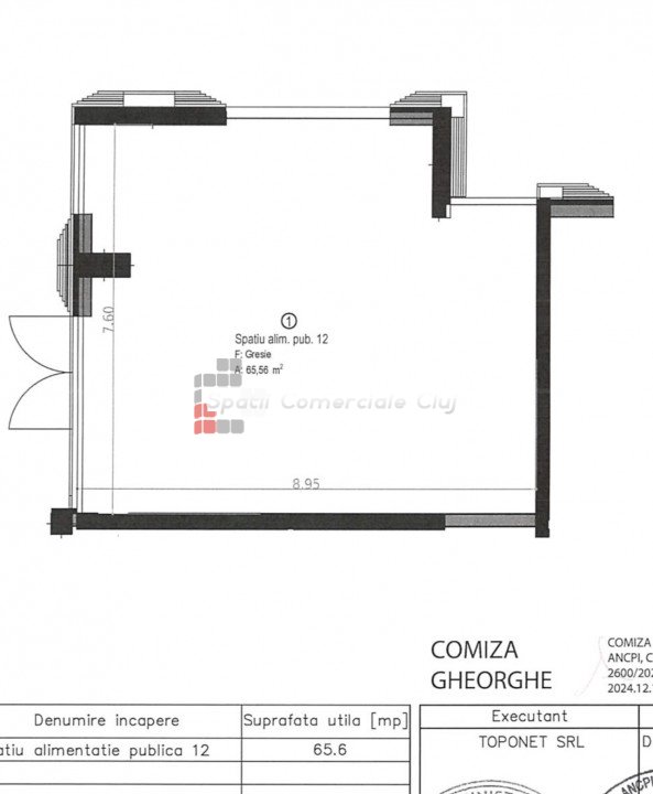 Se inchiriaza in ultimul proiect nou dat in folosinta in cartier Sopor, spatiu comercial open space in suprafata de 65mp utili, cu destinatie de Alimentatie Publica. Spatiul se afla la parterul imobilului si poate acomoda diverse activitati comerciale sau servicii de proximitate Suprafata utila 65mp si cote parti cu acces in zonele comune ale complexului comercial. Dispune de bransament trifazic 15Kw, apa curenta si scurgere in interiorul spatiului. Un loc de parcare subteran este inclus in pret. Incalzirea racirea se face pe baza de ventiloconvectoare.