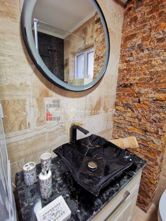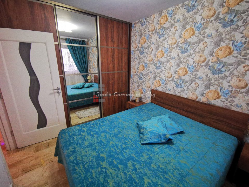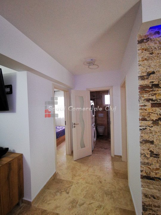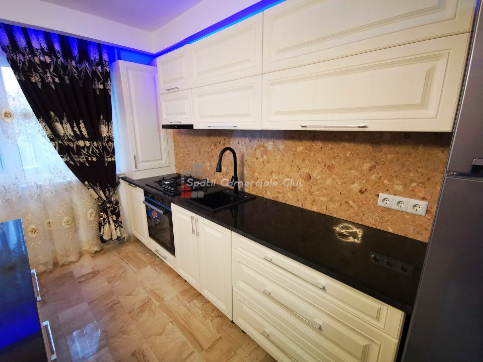 Apartament 3 camere, situat in Baciu intr-un ansamblu rezidential frumos si linistit, compus din 4 blocuri in forma de L, grupate doua cate doua. Intre primele doua este un parc de joaca pentru copii si intre celelalte doua este un teren de fotbal sintetic cu fileu de volei, cosuri de baschet si masa de ping-pong. Ansamblul este situat la intrare in Baciu (Baciu hills), Mega image si Profi, fiind la 2 minute de bloc, la 1,5 km de Lidl din Baciu si la 7 km de centrul Clujului. Apartamentul are 54 de mp utili + 6mp balcon. Apartamentul este nou, nu a locuit nimeni in el, constructia fiind recent finalizata. Apartamentul este compartimentat in felul urmator: - 1 living cu bucataria open space, - 1 dormitor, - 1 camera cu canapea si birou, - 1 baie si un 1 balcon. Apartamentul este utilat si mobilat modern. Dintre finisaje si dotari mentionam: - marmura de 2 cm Breccia Sarda si scapitat (provenienta Egipt) pentru design, - incalzire in pardoseala, - in bucatarie masina de spalat vase (BEKO), cuptor electric(BEKO), plita pe gaz (BEKO), frigider capacitate 500 L (BEKO), hota (WHIRLPOOL), - blaturile de pe insula (QUART), pe masa de lucru sunt din marmura de 3 cm grosime, cu contrablat de 1 cm din marmura, - banda LED cu mai multe culori, montata in scafa de rigips. In baie este masina de spalat si uscator WHIRLPOOL, pardoseala de aici este placata cu marmura. Separat se poate achizitiona o parcare subterana ,la pretul de 6000 euro. Este ideal pentru persoane care isi doresc un apartament cu bun gust, o zona linistita si retrasa cu teren de baschet. Imobilul este situat în zona liniștită, amenajat cu spatii verzi și locuri de joaca pentru copii, in apropiere de mijloace de transport in comun, magazine, farmacii si alte facilitati ale zonei.
