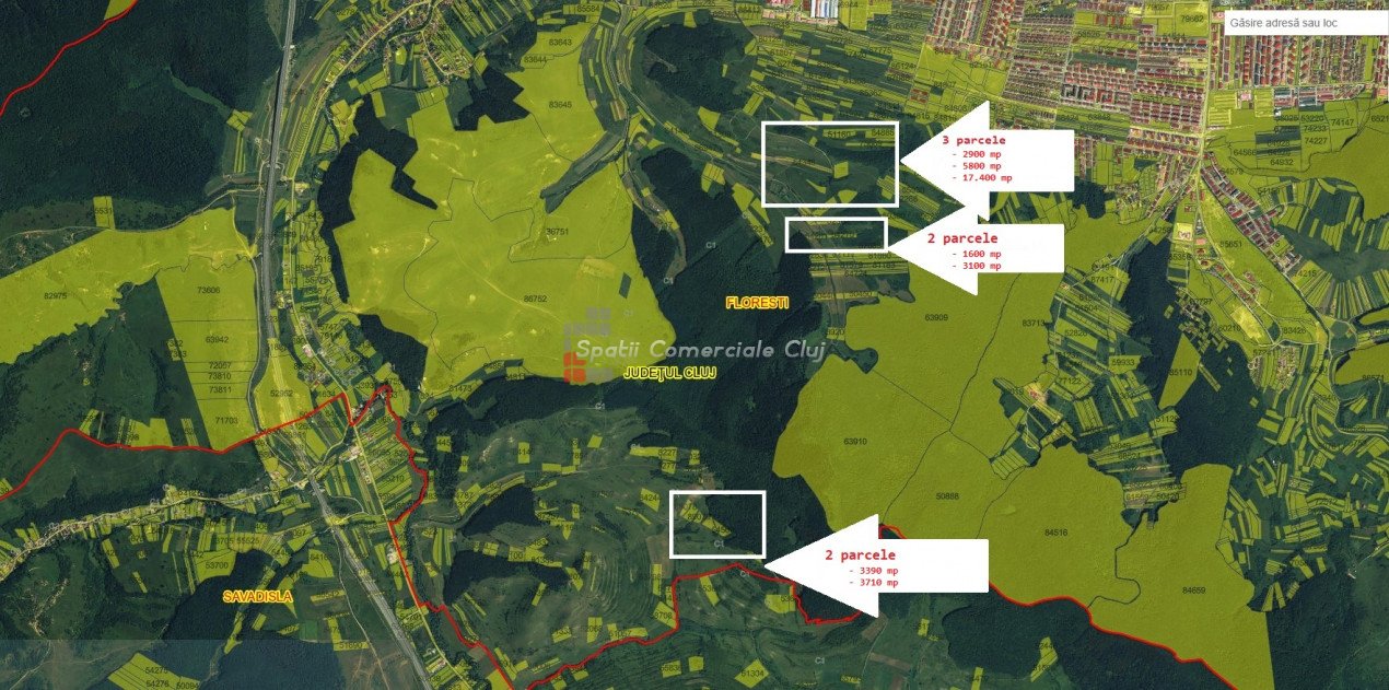 Aer curat si liniste pentru activitati in aer liber sau poate investitie de viitor? Spatii Comerciale Cluj va aduce in atentie posibilitatea achizitionarii a 7 parcele de teren cu o suprafata totala de 37.900 mp, astfel: - 17400 mp - 5800 mp; - 2900 mp; - 1600 mp; - 3100 mp; - 3390 mp; - 3710 mp; Parcelele se afla intr-o zona aerisita, cu o priveliste frumoasa si in proximitatea padurii. In cartea funciara terenurile sunt cu destinatie "Faneata" - fiind o interesante pentru impadurire sau pentru activitati in aer liber. La doar 14 km de centrul orasului Cluj-Napoca, cu acces foarte bun, terenurile se pot dovedi o buna investitie de viitor. Acces cu auto 4x4 la terenuri. CF-uri curate, libere de sarcini. Se vand de pe persoana fizica dupa finalizarea dosarelor de premptiune. ID P 45856