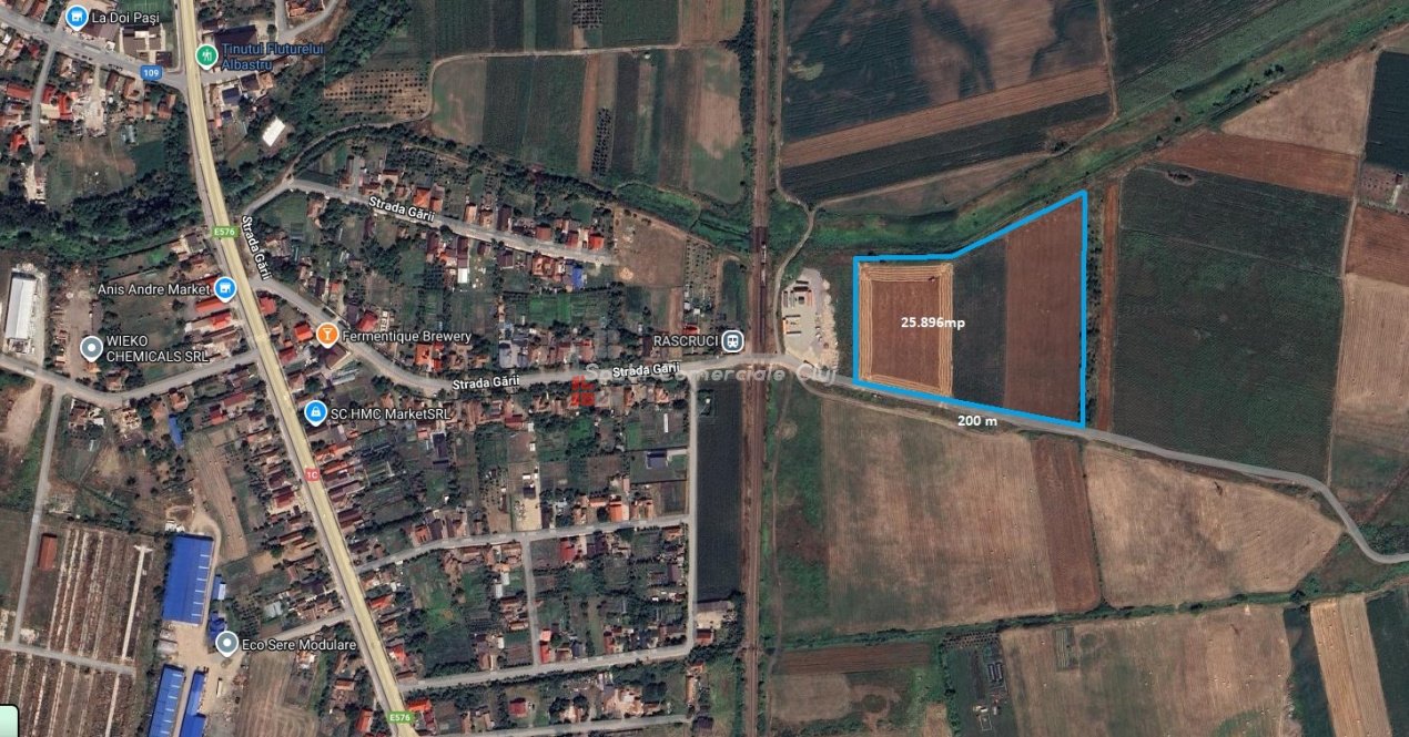 Teren pentru constructii industriale, servicii si depozitare in suprafata de 25.896mp Situat langa halta Rascruci, jud. Cluj.la 600m distanta de limita parcului industrial Tetarom III si 17km (20min) de aeroportul Cluj Parcela plana cu front 200m la drum de exploatare agricola. Este necesar PUZ, utilitati la 100m de limita parcelei