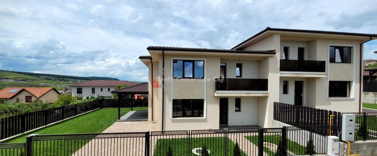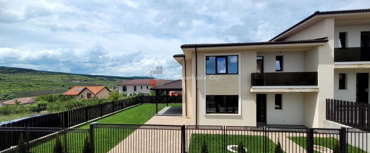 Va propunem spre achizitie o casa nou construita situata intr-o zona superba cu priveliste, la intrare in Chinteni, aproape de statia de autobus de Cluj (300 m) si de magazinul Profi. Imobilul face parte dintr-un ansamblu 6 case cuplate. Compartimentarea este urmatoarea: Parter: living, bucatarie, baie, hol, terasa. Etaj : 3 dormitoare, 2 bai, hol ,balcon. Suprafata utila este de 120 m2 plus doua terase si un balcon in suprafata de 25 m2. Terenul total este de 317 m2. Casa se preda finisata la exterior(la fel ca in pozele atasate) si semifinisata la interior (un strat de glet, instalatii trase la pozitii, incalzire in pardoseala parter si etaj, sapa turnata, centrala, izolatie si gips carton tavan etaj). La constructia caselor s-a folosit Caramida Cemacon de 25 cm, acoperis de tigla Terran, geamuri Salamander cu profil de Green Evolution 76, izolatie exterioara cu polistiren de 15cm, tencuiala siliconica. Pretul este usor negociabil si are TVA de 21% inclus.