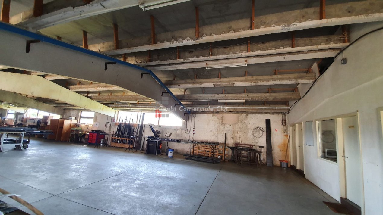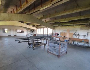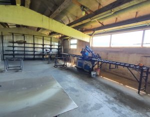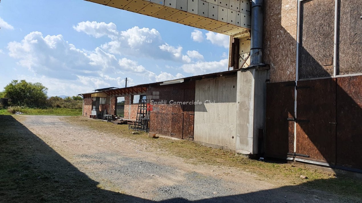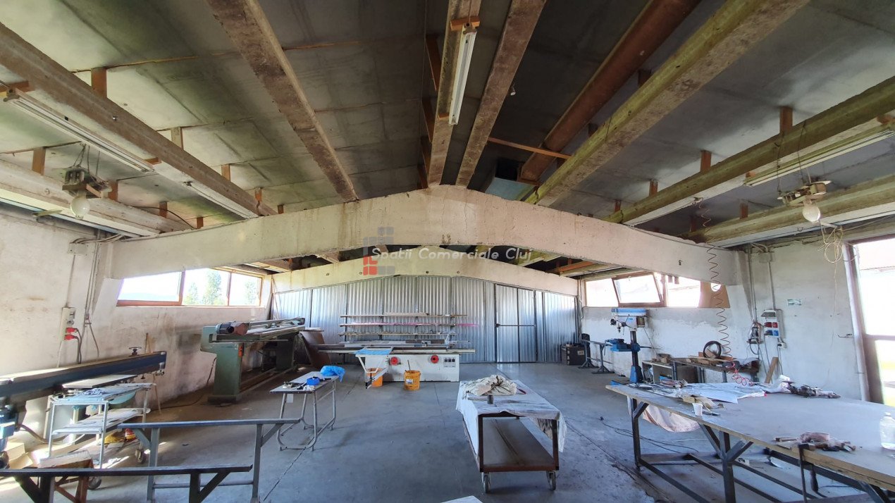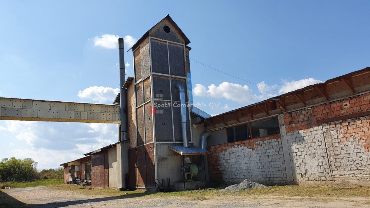 Va prezentam spre vanzare spatiu de productie in localitatea Sancraiu, jud. Cluj, situat la 6.5km din centrul Huedin. Spatiul se compune din hala de productie 787mp, garaj/depozit 116mp si curte proprie in suprafata de 1729mp. Are urmatoarele caracteristici: - an constructie: 1986 - pereti din caramida pe fundatie din beton - suprafata de 787 mp e separata in 5 compartimente dupa cum urmeaza: 1) 60 mp, 2) 60 mp, 3) 120 mp, 4) 487 mp, 5) 60 mp (birou + sala de mese + grup sanitar separat pentru barbati, femei) - dimensiuni hala: lungime: 72.36 m; latime: 10.91 m - dimensiuni spatiu de depozitare/garaj: lungime: 15 m, latime: 7.70 m - acces pentru orice tip de autovehicul inclusiv camioane de mare tonaj, drum de acces pietruit - prevazut cu Intrare din fata si lateral; - structura acoperis alcatuita din grinda de beton, izolatie termica acoperis cu polistiren de 10 mm, acoperire cu tabla cutata zincata - ferestre termoizolante din lemn - pardoseala din beton industrial - hidrant interior - echipament PSI exterior: 2 buc - sistem de instalatie cu aer comprimat - sistem de exhaustare pentru rumegus - incalzire cu ventilatie de aer cald - utilitati: apa potabila de oras, canalizare, gaz nu exista momentan, curent trifazic putere instalata: 50 kW - centrala termica pe lemn - parcare spatioasa. Biroul, sala de mese si grupul sanitar (total 60 mp) au urmatoarele caracteristici: - acces birou separat din fata cladirii si din hala de productie - izolatie termica din exterior (polistiren) - incapere armonioasa cu multa lumina naturala, geamuri termoizolante din lemn (birou) - grup sanitar separat pentru barbati si femei - incalzire in pardoseala: birou, grup sanitar, sala de mese.