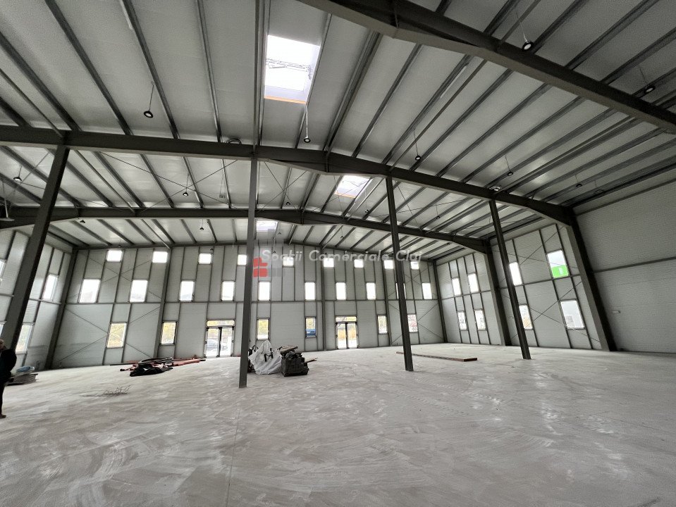 Spatii Comerciale Cluj va ofera teren cu hala constructie 2022, situata in zona parcului industrial Apahida Suprafata totala a terenului este de 4000mp, curte libera de 1500mp pavata in totalitate si ingradita Constructie hala noua pe structura metalica autoportanta, cu o deschidere de 30m fara stalpi interiori in suprafata utila de 2200mp Izolata cu panouri sandwich, podea beton elicopterizat, usi sectionale si pietonale de acces, iluminatoare, instalatii noi si toate utilitatile. Posibilitate de amenajare birouri la mezanin in suprafata totala de 360mp. Situat la 3,5km de Aeroportul International Cluj Napoca, 2.5km de la centura Valcele - Apahida Pozitie foarte buna, cu expunere comerciala pentru firmele de profil.